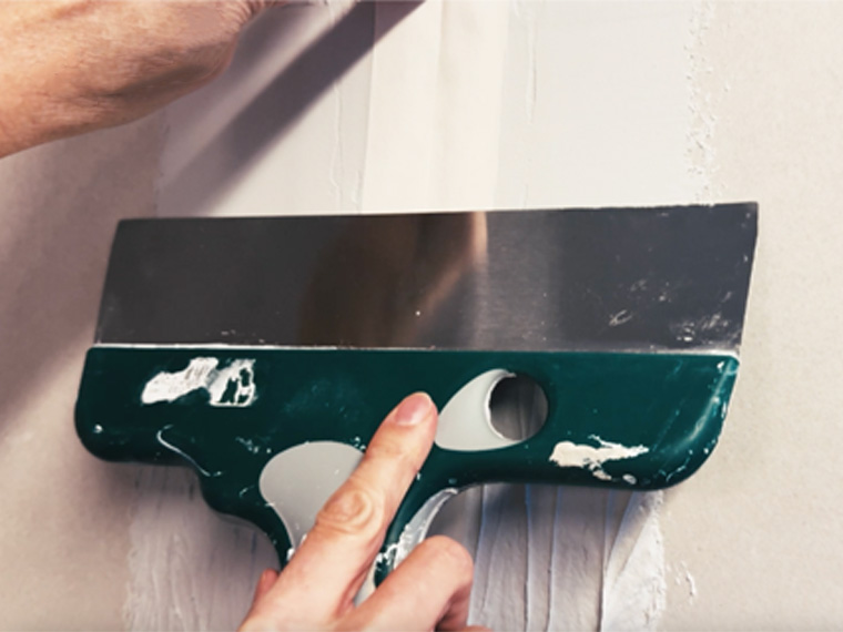 - När spacklet fortfarande är vått sätter du på spackelremsan med det förvikta vecket in mot skarven. Tryck fast remsan med bredspackeln och pressa mot det våta spacklet. Dra sedan bredspackel över remsan så skarven blir helt slät. Låt torka helt innan du går vidare.*