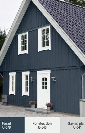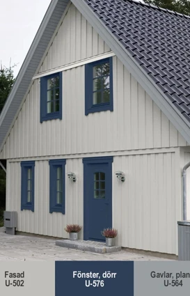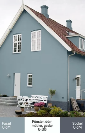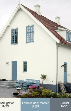 Ju fler detaljer omkring huset som är kordinerade med kulörer, desto mer genomtänkt verkar det. Så kom ihåg grunden och gavlarna, de är också en viktig del av bilden. Det samma gäller utemöblerna och kanske också soptunnan och brevlådan!
