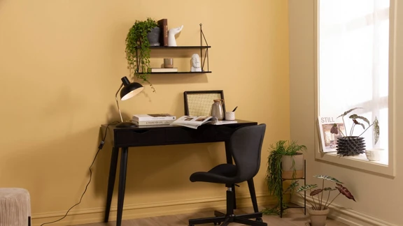 Gröna kulörer tenderar att uppfattas som lugna och behagliga för ögonen. Samtidigt kan dessa kulörer även hjälpa dig att arbeta mer målmedvetet och koncentrera dig. Här har vi valt kulörerna 4503 Vårduft på den övre delen av väggen och IN-779 Summers Passing på den nedre delen.