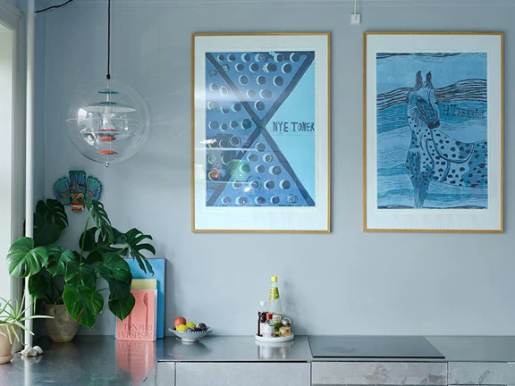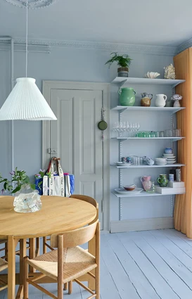 Ljusa, gråblå toner och tidlösa material skapar lugn i Sofie Holst Nyvolds hem.