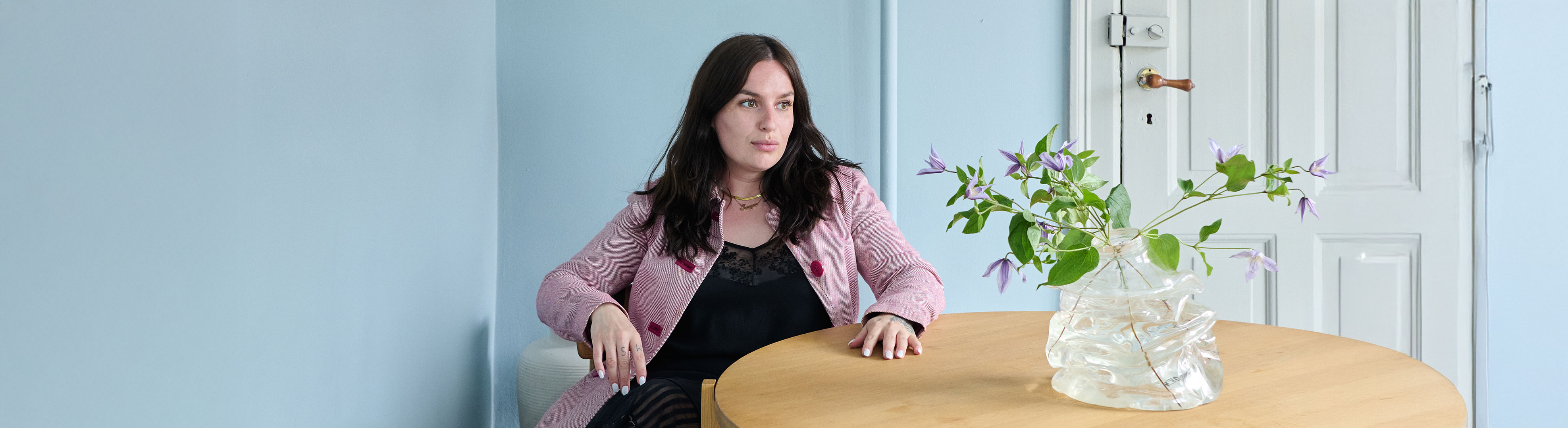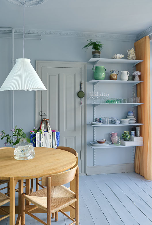 Ljusa, gråblå toner och tidlösa material skapar lugn i Sofie Holst Nyvolds hem.