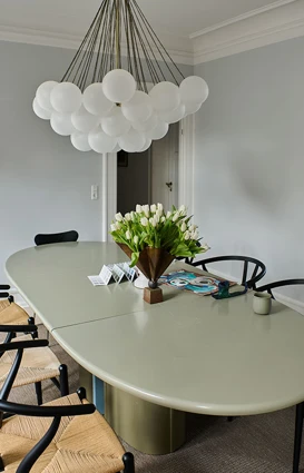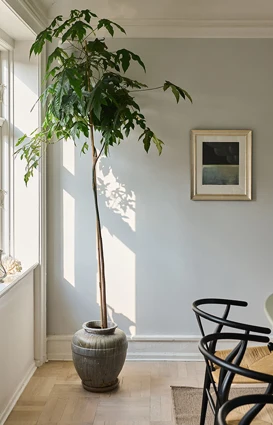 "Jag tänker mycket på stämningar och hur kulörer påverkar oss. Därför använder jag ofta dämpade nyanser, gärna naturkulörer, som mjukar upp rummet. Vi har valt bort vitt i de flesta rum till förmån för lugna kulörer som ger samma rena bas som en vit kanvas kan göra. Samtidigt som detaljer kan i lyftas fram och förstärkas i varje enskilt rum."