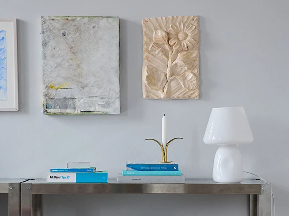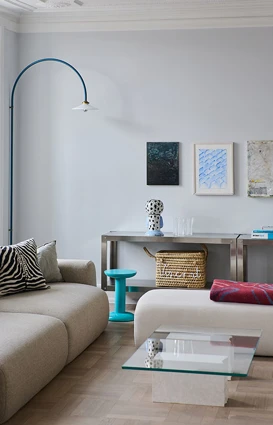 Hon har en tydlig kärlek till blå toner som ger plats för andrum.