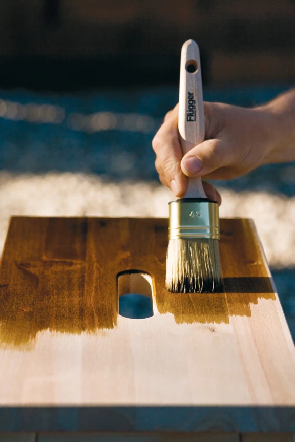 2. Applicera träskyddet eller oljan med en pensel – använd t.ex. Flügger Wood Tex® träskydd eller olja. Måla med långa, jämna stråk och täck med minst två skikt så att träet blir mättat.
