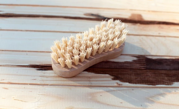 - Börja med att ta bort ytlig smuts och skräp med en spackelspade och tvätta av träet med rent vatten. Använd gärna en grov skurborste eller en borste med vattenanslutning och skrubba brädorna ordentligt tills all lös beläggning har avlägsnats. Om rengöringen får träet att resa sig på enstaka ställen kan du slipa lite med sandpapper.
